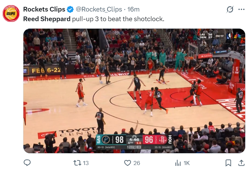 北京时间1月21日,NBA常规赛,火箭111-106逆转马刺拿到三连胜,这场比赛火箭一度落后马刺16分之多,可在末节里德-谢泼德大爆发,加上火箭的防守层级一些提升到Best级只让马刺单节拿到14分,火箭官方也晒出谢泼德末节12分的贡献鼓掌感谢。